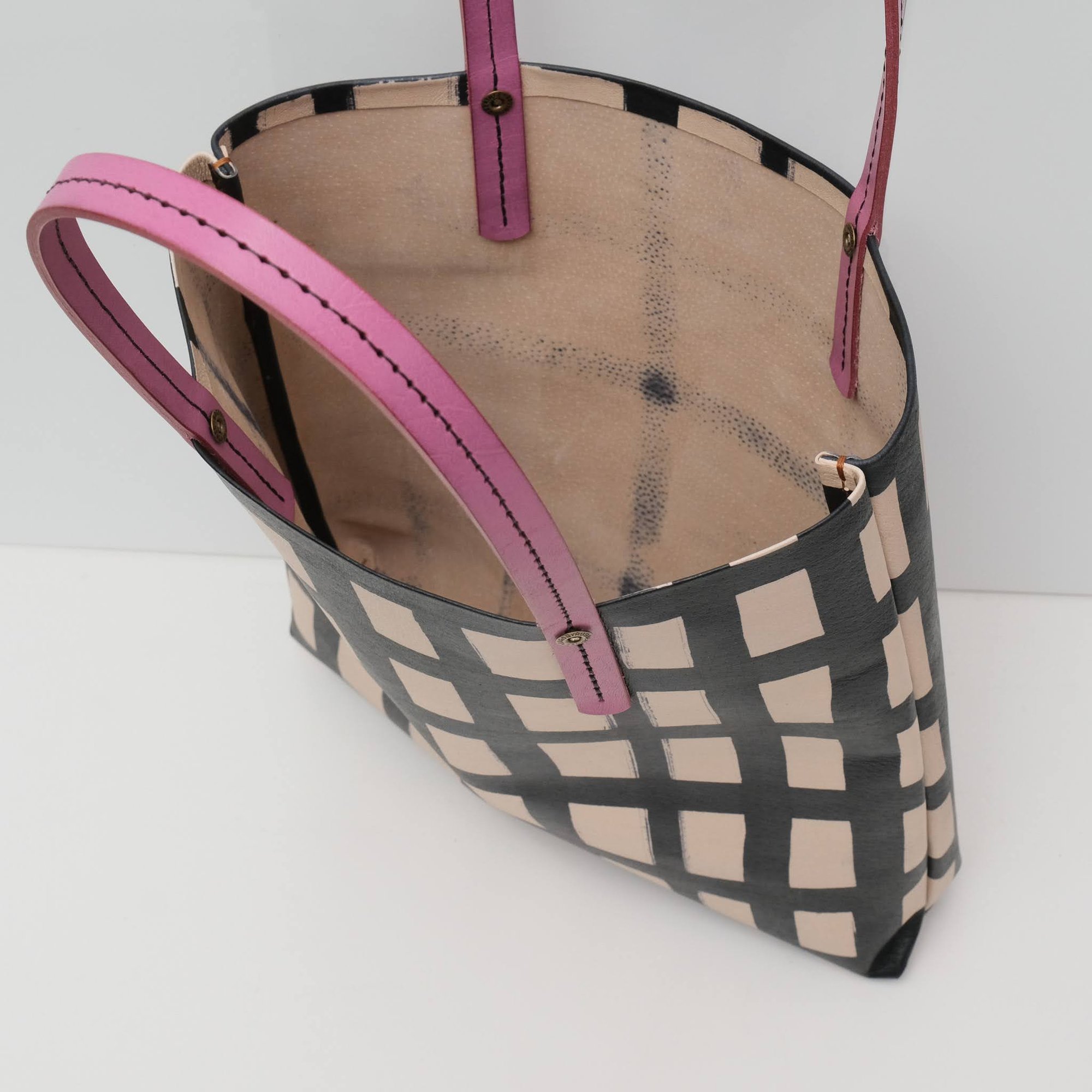 This Grid Series is a happy experiment on pigment and pattern. These are hand-printed on natural toned pigskin leather and then sealed. No two will ever be alike! How fun is that? It will eventually develop a patina with use.