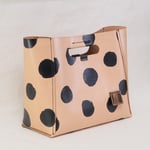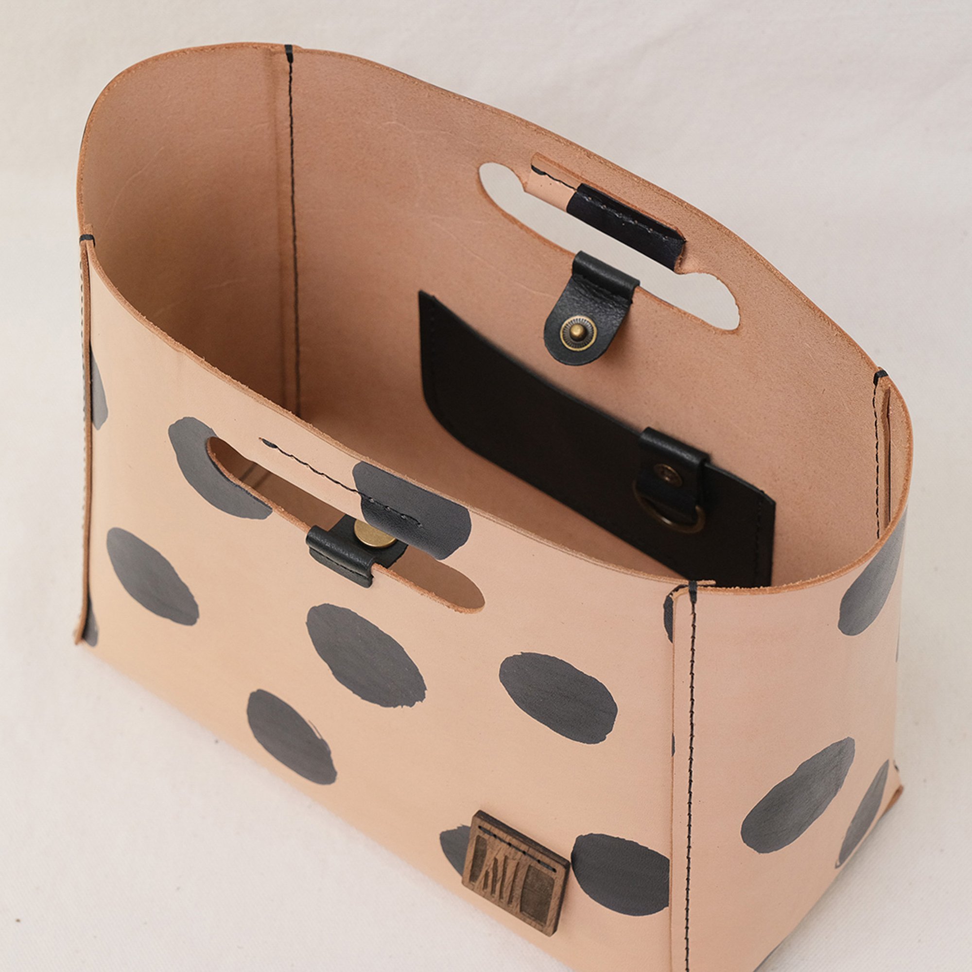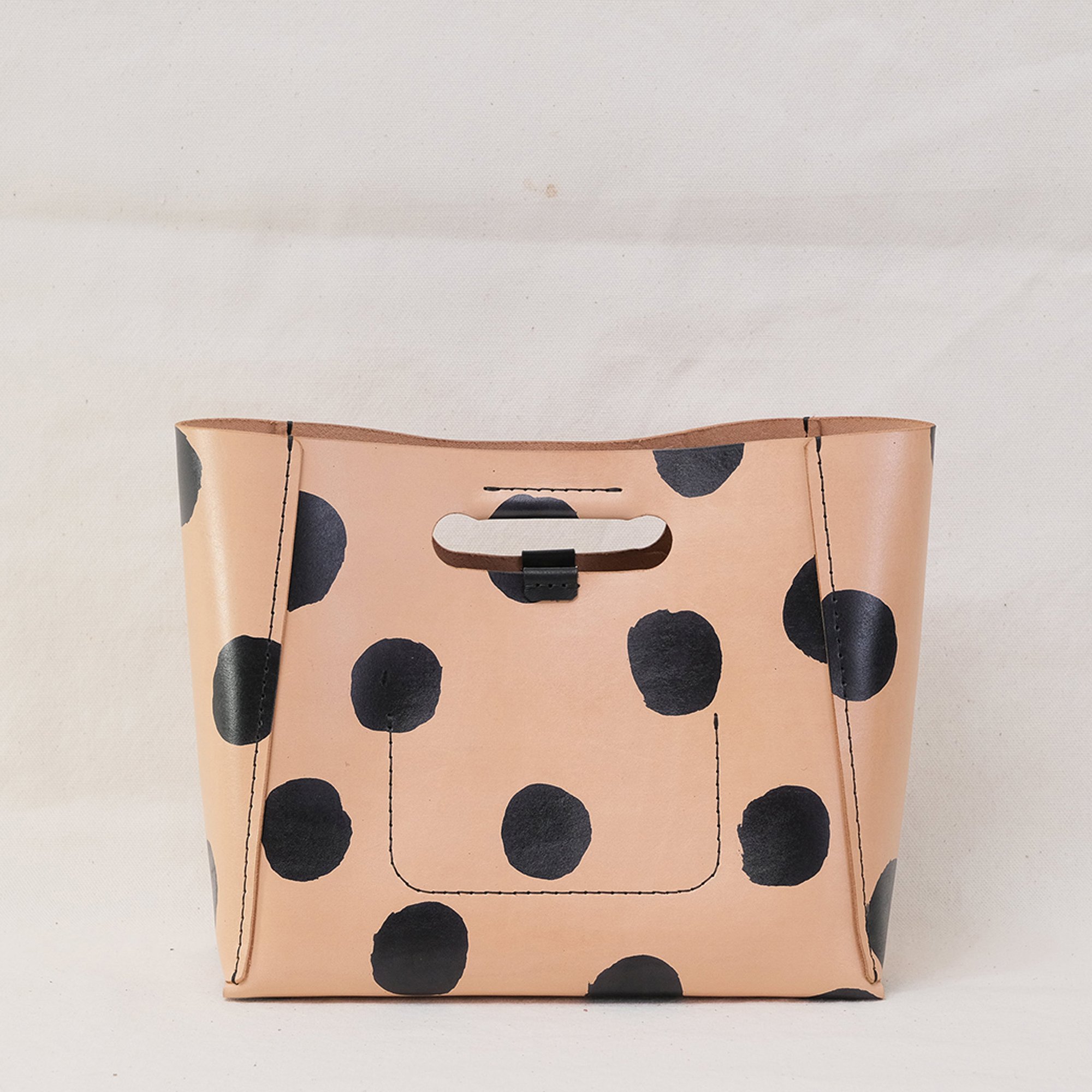 This Dots Series is a happy experiment on pigment and pattern. These are hand-printed on vegetable-tanned leather and then sealed. No two will ever be alike! How fun is that? It will eventually develop a patina with use.